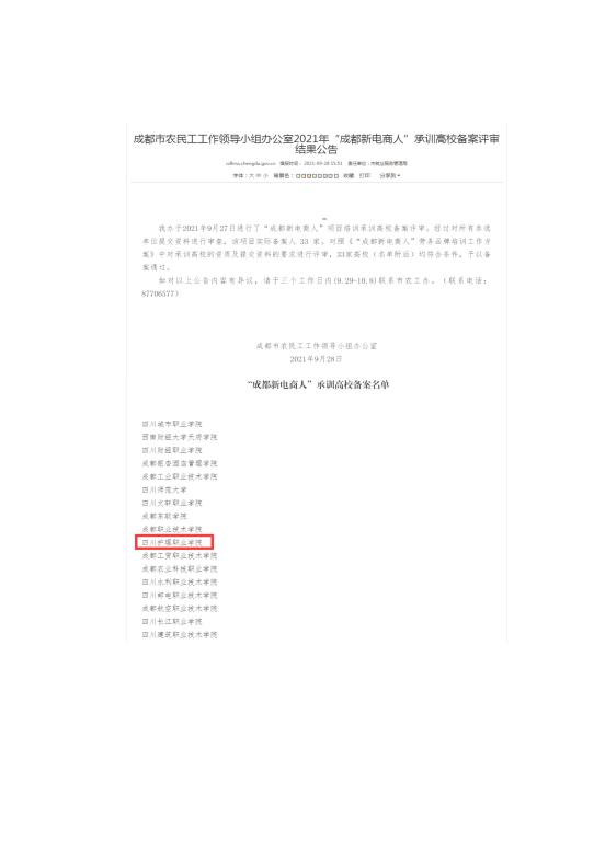 9月28日,成都市人力资源和社会保障局农民工工作领导小组办公室公布了2021年“成都新电商人”承训机构名单,学院喜获2021年“成都新电商人”承训机构。