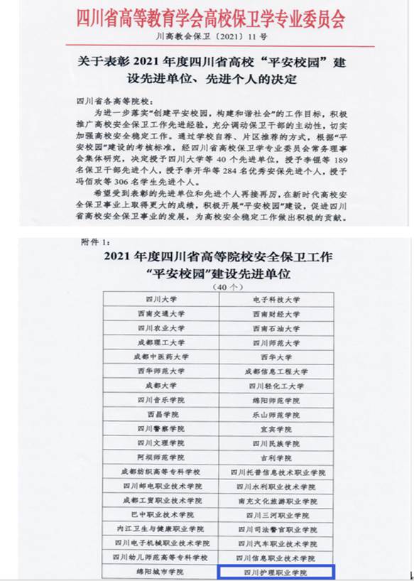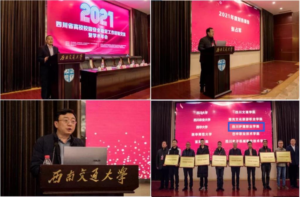 近日,在2021年四川省高校校园安全稳定工作经验交流暨学术年会上,学院被评为2021年度四川省高校“平安校园”建设先进单位,潘建平、李凌昊2名同志荣获平安校园建设保卫干部先进个人,杨先国、林跃菊2名安保人员荣获平安校园建设优秀安保先进个人,钱程、朱俊霖2名同学荣获平安校园建设学生先进个人。会议对2021年度四川省高校“平安校园”建设先进单位和个人进行了表彰。