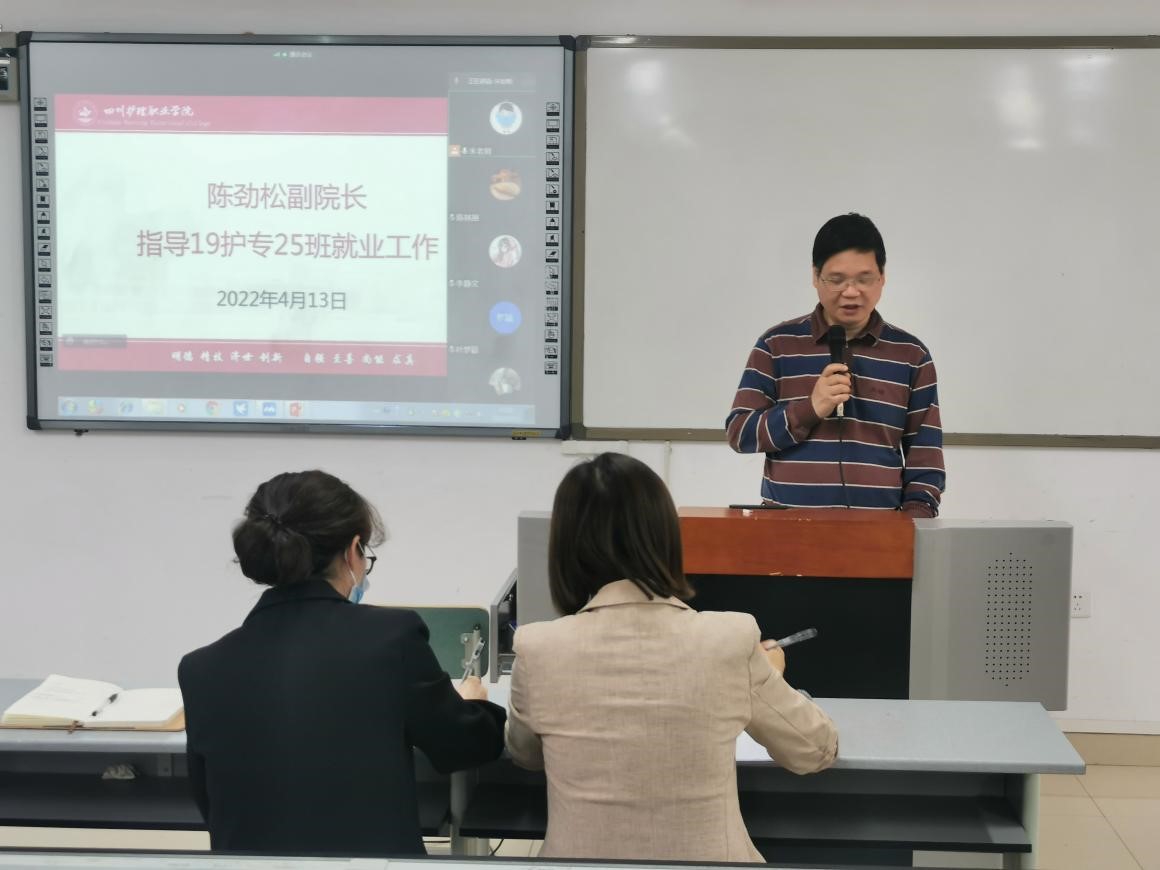 会前,陈劲松副院长深入了解该班学生就业现状、就业意向、预期目标及目前存在的困难,认真分析了当前就业形势与前景。会中,陈院长全面分析今年全国就业形势,有针对性的引导学生要正确认识自我、积极就业、规划人生,并对护理专业学生就业提出了三点建议:一是提高思想站位,树立家国情怀,为民健康服务。他引导学生要站在为国家为社会为民族为卫生健康行业做贡献的角度思考问题,坚守“以人民健康为中心”思想,践行为广大群众健康服务的使命,做强国有我的青年人,把个人奋斗融入党和人民事业,积极投身新时代中国特色社会主义事业建设中。二要提高自我认识,转变就业观念,拓宽就业思路。他引导学生要关注“大卫生大健康”行业,鼓励学生积极响应党和政府的号召,积极到农村去、到西部去、到基层去、到国家最需要的地方去建功立业,多关注基层卫生医疗机构、养老和婴幼儿等行业。三是先就业后择业,同学互帮互助,共享就业信息。鼓励学生在找工作的时候,适当降低就业期待值,保障“先就业”的目标,经过工作历练,获得进步和成长,然后“再择业”,实现更好就业。同时关注各类就业信息,同学之间互帮互助,共享就业信息和机会,助力全班提升就业质量和水平。他指出,学院始终是学生的坚强后盾,有困难和问题都可以寻求学院和辅导员的帮助。