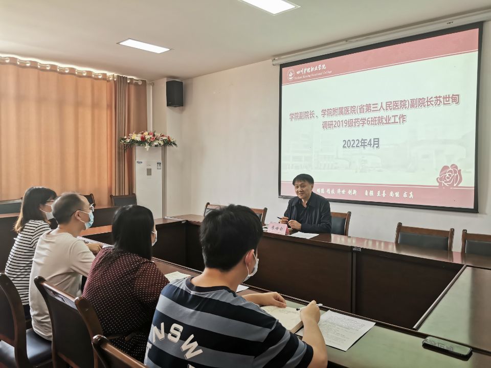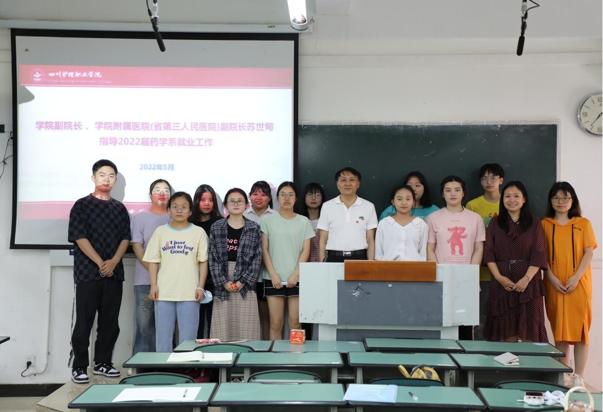 此前,苏世甸针对该班学生就业情况进行了就业工作专题调研。在深入了解学生的就业现状、就业趋势与学生就业中存在的困难后,苏院长结合当前药学专业的就业形势与前景,对该班级的就业工作给予具体指导:一要引领学生树立“先就业再择业” 的就业观念。二要指引学生由成人、成熟到成才逐步转型。三要让学生了解就业形势,正确处理“适应与改变”的关系。四要让学生意识到“生存与发展”并存,鼓励学生克服困难,突破自我。