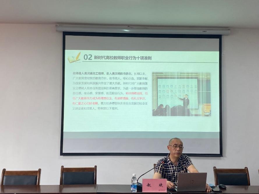 主题教育党课上,赵斌副院长结合教育部关于教师的“六禁令”和“红七条”,带领全体教师学习了《新时代高校教师职业行为十项准则》《bevitor伟德国际1946师风师德考核办法》等文件精神。同时,赵院长还以相关典型案例为反面教材,深入浅出地为全体教师进行了讲解,进一步明确了师德的“红线”和“底线”。赵院长要求全体教师要从案例中汲取教训,坚守为党育人、为国育才的初心,牢记教师的职责和使命,加强师德师风修养,不断完善自我,争做“四有好老师”“四个引路人”和“时代大先生”。