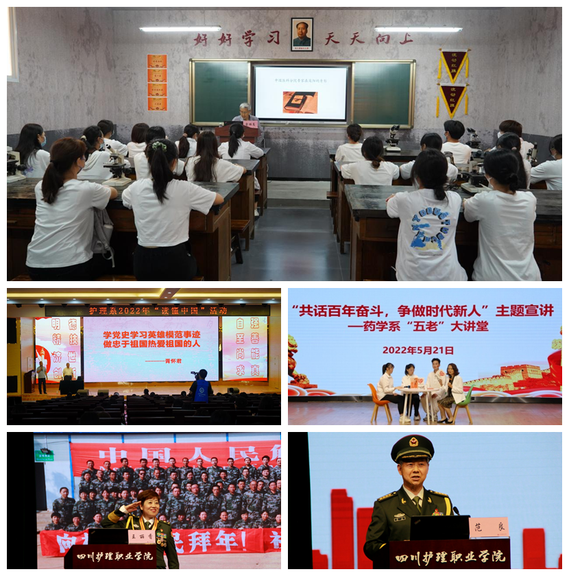 学院邀请了5位“五老”走进校园,结合自身经历进行宣讲。学院退休教师、心理健康教育专家王洁玉,针对青年学生学习成长中遇到的困惑进行分析解读,指导学生学会调节情绪、释解压力,看清方向,勇追梦想。学院退休老领导雷鹏高,将校史融入百年党史进行宣讲,勉励青年学生脚踏实地学好专业知识,坚定理想信念,为国家的卫生健康事业贡献青春力量。全国抗震救灾模范、四川省优秀共产党员、五一劳动奖章获得者、优秀退役军人胥怀君讲述了黄继光的英雄壮举和涂伯毅的人生故事,希望同学们以实际行动诠释心中的信仰,更好地扎实工作、服务人民,为中华民族的伟大复兴贡献自己的力量。成都军休红色宣讲团成员王丽香分享了自己的军医生涯,希望同学们将“赤诚红心”的爱党爱国情怀和“白衣执甲”的高尚医德医风紧密结合。范良则分享自己参加对越自卫还击战和老山作战,4次荣立战功的经历,教导青年学子在思想洗礼和实践锻炼中不断增强做中国人的志气、骨气、底气,努力成长为有理想、敢担当、能吃苦、肯奋斗的新时代好青年。