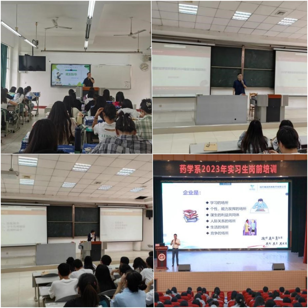 自5月以来,学院通过线上和线下相结合的方式,广泛邀请行业、企业专家对即将实习学生开展系列培训,内容涵盖实习管理制度、就业政策、职业防护、人际交往与社会适应等方面。各系结合专业特点,分别邀请了国药集团、学院附属医院等相关专家到校开展专题讲座。
