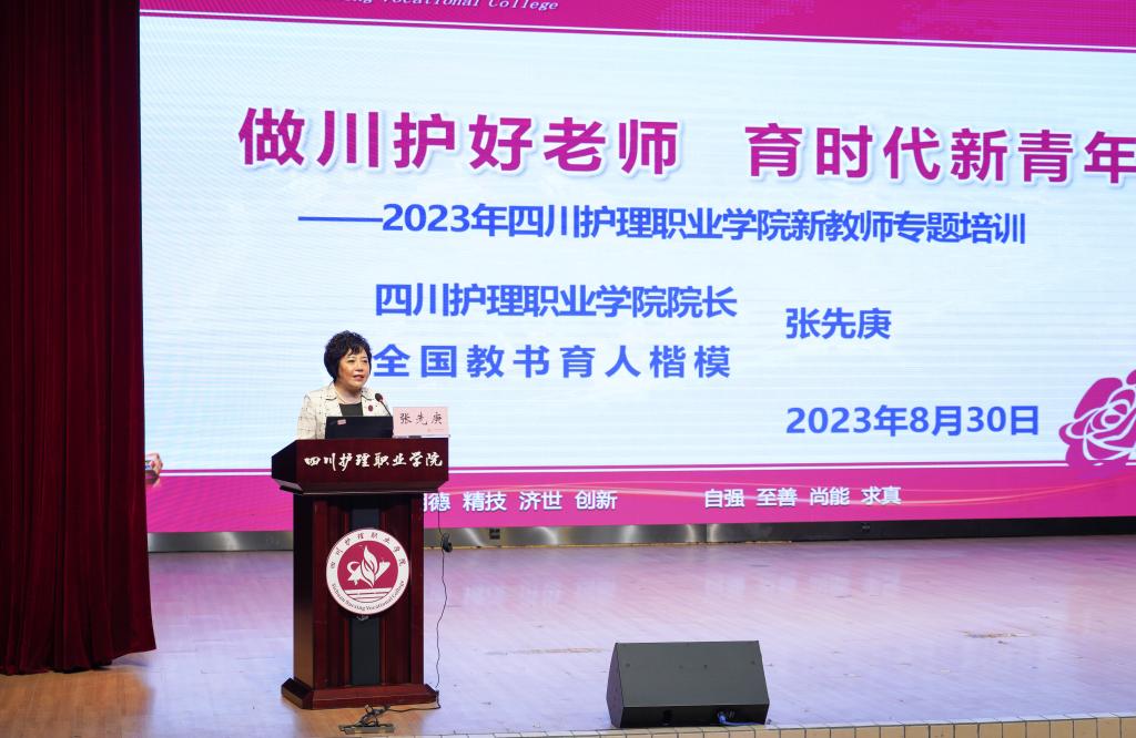 张先庚以“做川护好老师,育时代新青年”为题作开班第一课。一是全面介绍学院基本情况、发展现状和未来前景,解读了“五爱五尽”家校情怀和“五大强校”战略的内涵,展示了学校在人才培养、专业建设、教学改革、科学研究、社会服务等取得的改革成效。二是宣讲党的二十大精神和习近平新时代中国特色社会主义思想,并结合学校实际,全面讲解卫生健康职业教育大有作为的美好前景;三是深入阐释新时代教师应具备的素养,重点从教师应具备的十大素养进行讲解,希望新教师做“五爱五尽”川护人,传“时代大爱”,担“教育大任”,做“国之大者”,育“时代新人”。张院长希望大家将个人理想与学院发展融为一体,将感恩与责任完美结合,在“川护”温馨的大家庭安心从教、舒心从教、专心从教,共同谱写学院新时代高质量发展新篇章。