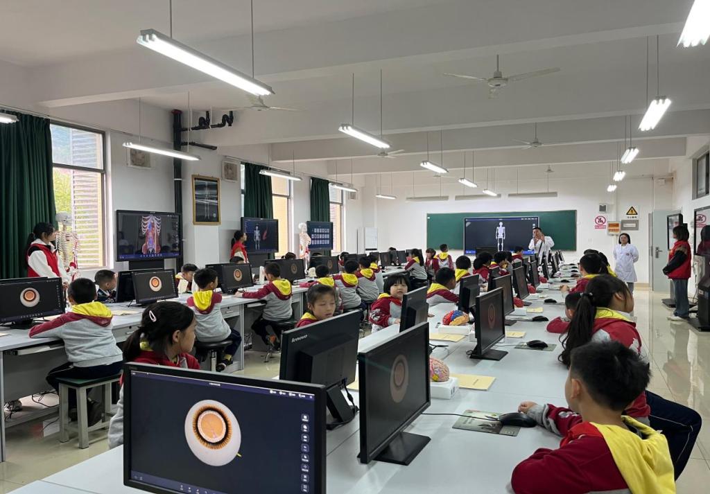 在虚拟仿真展厅,刘靓老师指导小学生们操作3D数字人多媒体系统,沉浸式体验人体三维解剖结构。通过亲眼见、亲手摸、亲身感的个性化自主学习,小学生们了解到牙、心脏、肺、肾、阑尾等人体器官构造以及新冠病毒结构。在此过程中,他们展现出了浓厚的学习兴趣。