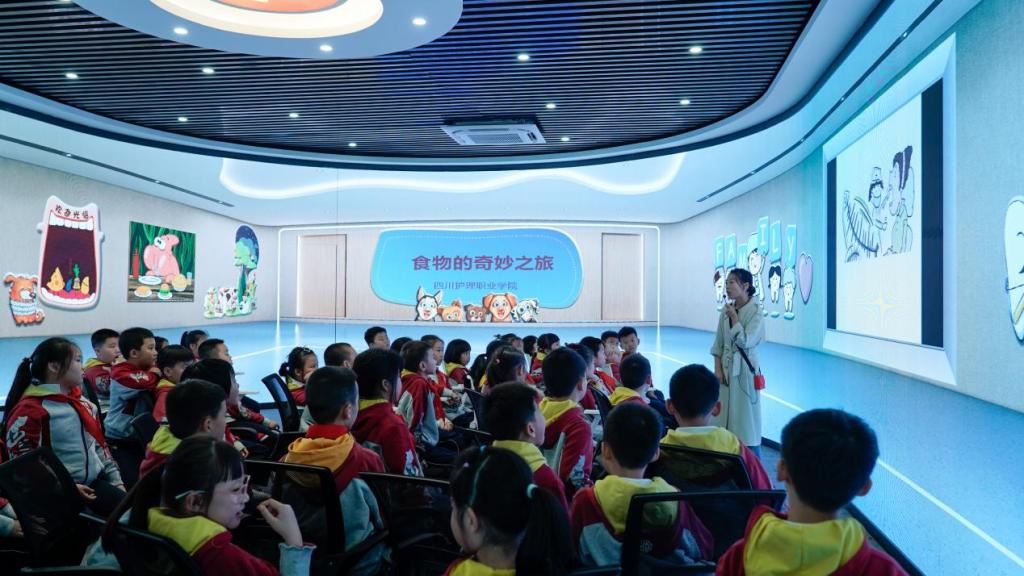 在校内思政实践教学基地——360°全沉浸式体验厅,梁嘉钰老师以食物在人体口腔、咽、食管、胃、小肠、大肠、肛管的奇妙旅程为线索,以“探索人体消化系统的奥秘”为主题,为小学生们带来“了解身体结构”的卫生健康专题讲座,帮助大家增强卫生健康知识,养成良好的卫生健康习惯。