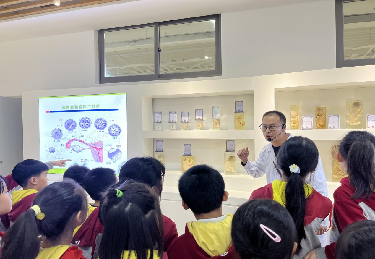 在生命历程馆,曾勇老师带领小学生们了解生命的起源、人类胚胎发育过程、消化系统结构等相关知识。馆中展示的各类标本,呈现出人的完整生命历程,小学生们从中领悟到生命孕育过程的艰难曲折,感悟到身体健康弥足珍贵的道理,从而帮助他们树立珍惜生命、热爱生命、呵护生命健康的意识。
