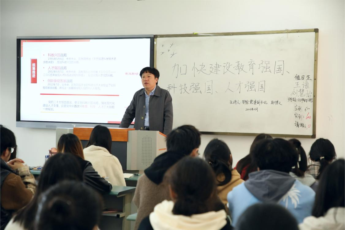彭博文副书记以“加快建设教育强国、科技强国、人才强国”为题,系统讲述“教育、科技、人才”三大战略一体规划的重大地位和历史意义,深入浅出阐释教育、科技、人才是全面建设社会主义现代化国家的基础性、战略性支撑,推进中国式现代化建设要积极主动贯彻落实国家重大战略。他结合大健康产业发展实例,运用图文、数据等,讲解国家在教育、科技、人才方面取得的历史性成就,同时也指出在发展不平衡不充分方面,推进高质量发展还有许多卡点瓶颈,科技创新能力还不强等问题和困难,帮助同学们进一步认识我国政治、经济、教育、科技等发展状况,理解新时代青年肩上的历史重任,时代使命。