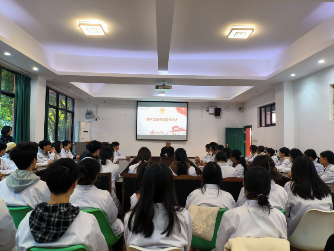 陈木之作指导讲话。他结合自身工作经历,与同学们分享了学习感悟,激励同学们从习近平新时代中国特色社会主义思想中感悟真理的力量、汲取无穷的智慧,提升自身能力,勇担时代重任。他指出,青年是祖国的未来和民族的希望,要牢记习近平总书记的嘱托,坚定理想信念,立志做有理想、敢担当、能吃苦、肯奋斗的新时代好青年,把个人的发展融入国之大局中,肩负重任与使命,为健康中国、乡村振兴、强国建设和民族复兴挺膺担当。