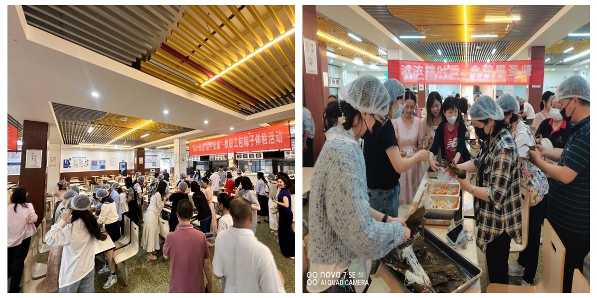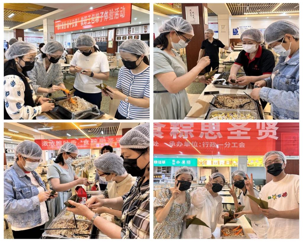 活动热火朝天,教职工们围坐在一起,有拜师学艺的,有传授技艺的,互相分享着包粽子的秘诀和技巧……捋粽叶、填糯米、加馅料、封粽口、扎绳,不一会儿,一个个各式各样的漂亮粽子呈现出来,大家一边包制粽子,一边交流节日习俗,现场洋溢着浓厚的节日氛围。