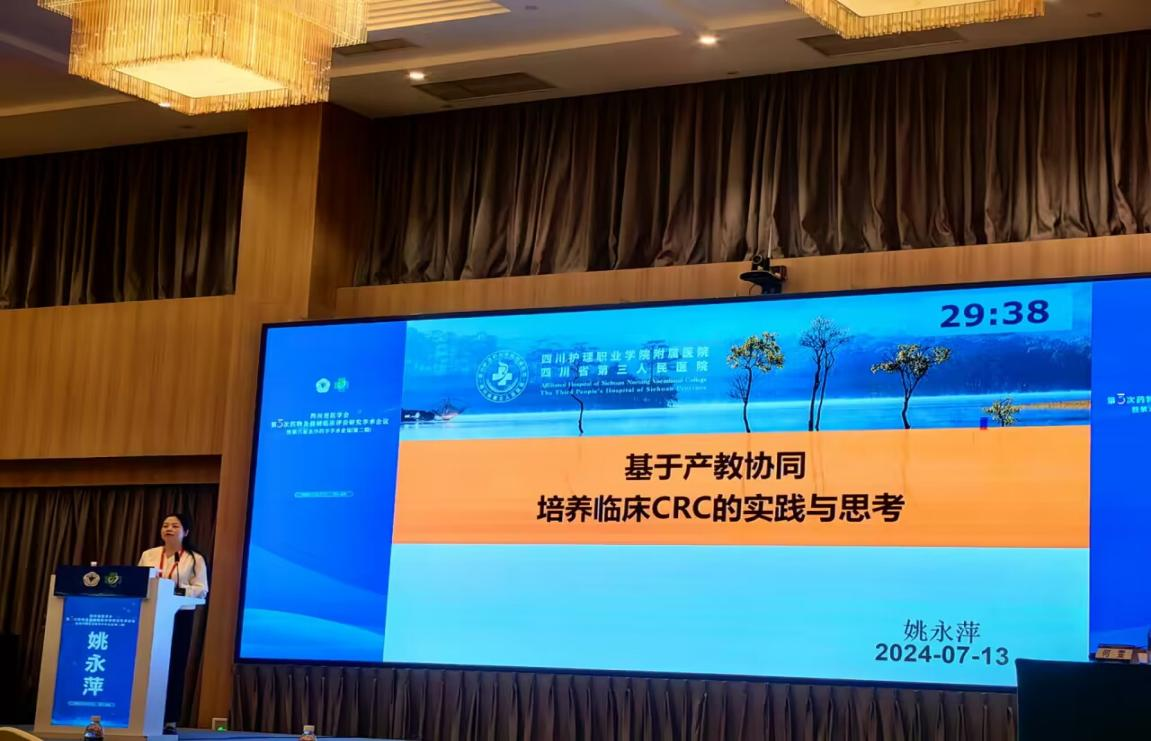 会上,姚永萍作了题为《基于产教协同培养临床CRC的实践与思考》的主题报告,她以药学系与德阳市医院GCP中心合办的首届CRC试点班为例,从职业调研、课程整合、培训、就业反馈等方面进行分享,从临床教育教学改革的角度,详细阐述了如何通过学校、医院及企业的合作,培养具有特色化、专门化高素质的临床研究协调员。