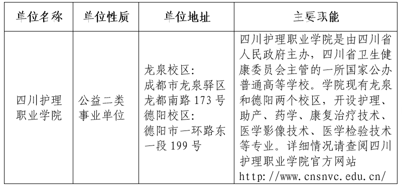 根据《事业单位人事管理条例》(国务院令第652号)、《事业单位公开招聘人员暂行规定》(人事部令第6号)、《四川省省属事业单位公开招聘工作人员实施细则(试行)》(川人发〔2006〕34号)和《四川省人力资源和社会保障厅关于卫生事业单位考核招聘急需紧缺卫生专业技术人员的通知》(川人社发〔2018〕49号)等有关规定,结合工作需要,我单位拟面向社会直接考核招聘5名工作人员。现将我单位2020年直接考核招聘工作人员有关事项公告如下(本公告同时在四川省人力资源和社会保障厅官网[http://rst.sc.gov.cn,下同]“人事考试专栏”和bevitor伟德国际1946官网[http:/,下同]上发布)。