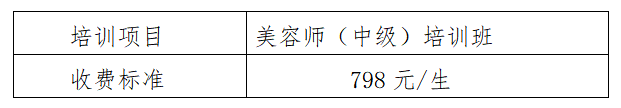 为贯彻落实《职业教育改革实施方案》,全面推进“校企合作、产教融合”改革,开展高质量职业培训,履行院校服务社会职责,完善人才评价体系,拓展社会化培训项目,加快推进职业技能等级认定工作,我院根据社会需求及我院实际,本着自愿的原则,现面向各医疗机构、相关人员等开设美容师(中级)培训及考核项项目,并制定收费标准公示如下: