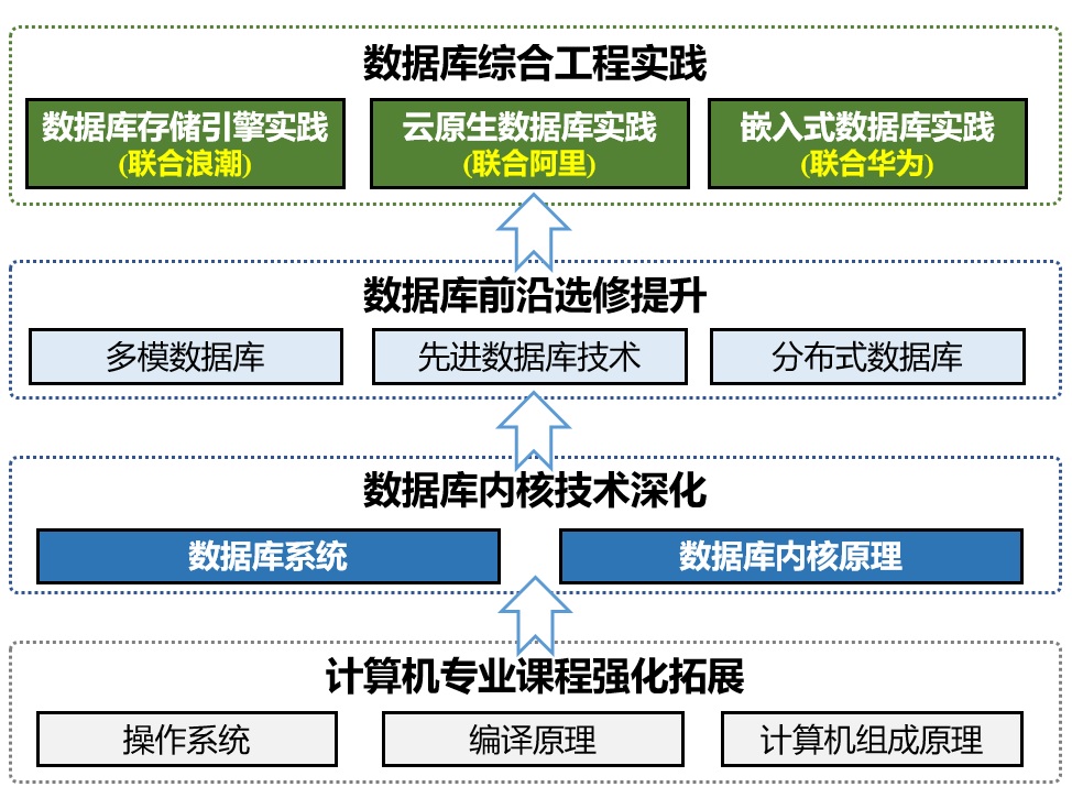 数据库作为关键基础软件,技术复杂、涉及领域多、技术发展快。学院成立数据库课程群教研室,深度参与教育部计算机领域本科教育教学改革试点工作计划(101计划),重构数据库课程体系与实验教学体系,面向不同类型学生开展国产数据库相关领域教学。针对计算机和软件工程本科生,目标是掌握数据库研发与运维能力,重点建设“数据库系统”课程,开设“先进数据库技术”等选修课程,同时引入数据库领域头部企业的实践课程。针对特色化示范性软件学院重点建设领域“基础软件(数据库)”、目标是培养国产数据领域的核心技术攻关人才,增设“数据库内核原理”专业课程,同时增加“分布式数据库”选修课程。针对计算机科学基础学科拔尖培养基地中的“计算机系统软件”方向,目标是培养拔尖创新人才,通过深度参加科研团队,在国家重大工程项目和头部企业关键技术攻关中锻炼核心能力。