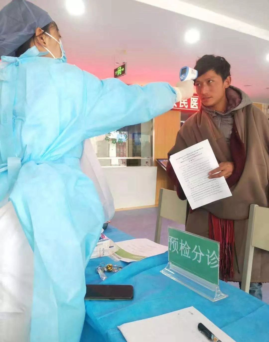 2013级“9+3”护理专业毕业生列木准正在预检分诊中心为患者测量体温