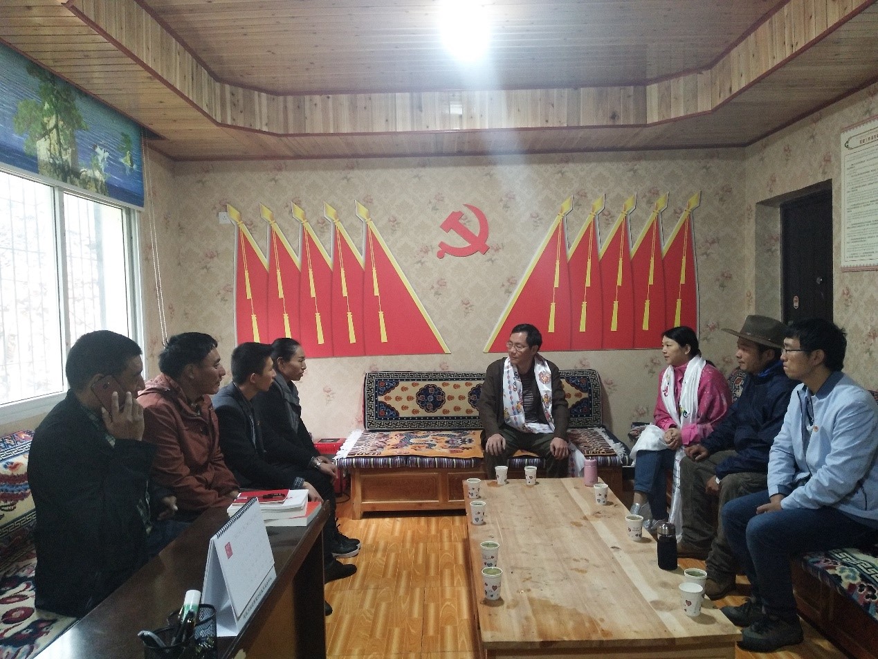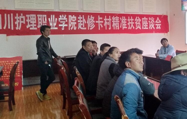 张书记一行抵达修卡村后,与乡、村干部、学院派驻干部及村民代表进行了座谈,认真听取驻村干部关于修卡村2018年上半年教育扶贫、产业扶贫、医疗扶贫、民生项目、农民夜校、物质脱贫与精神脱贫并举等各项扶贫工作的总结汇报,分析扶贫工作面临的问题和困难,研究讨论修卡村2019年顺利脱贫的对策措施。乡人大主席头丹卓玛代表修卡村对学院及两任驻村干部的真情帮扶和无私奉献表示衷心的感谢。参与座谈的乡、村干部和村民代表纷纷表示在我院大力帮扶下,有十足的信心如期实现整村脱贫摘帽。