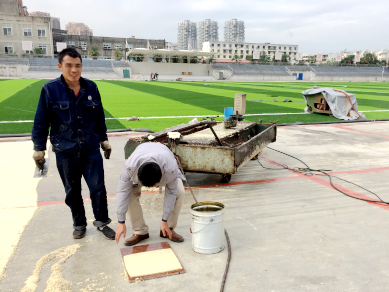 在场地混凝土基础建设达到设计要求并验收合格后开始面层施工,目前优质环保的人工草坪已经“长满”校园足球场地;白色环保塑胶颗粒在工人师傅脚下聚集、铺装粘贴,使跑道变成了白色的“纽带”;同时,省质检站正对施工中所采用的所有材料进行全方位抽检。