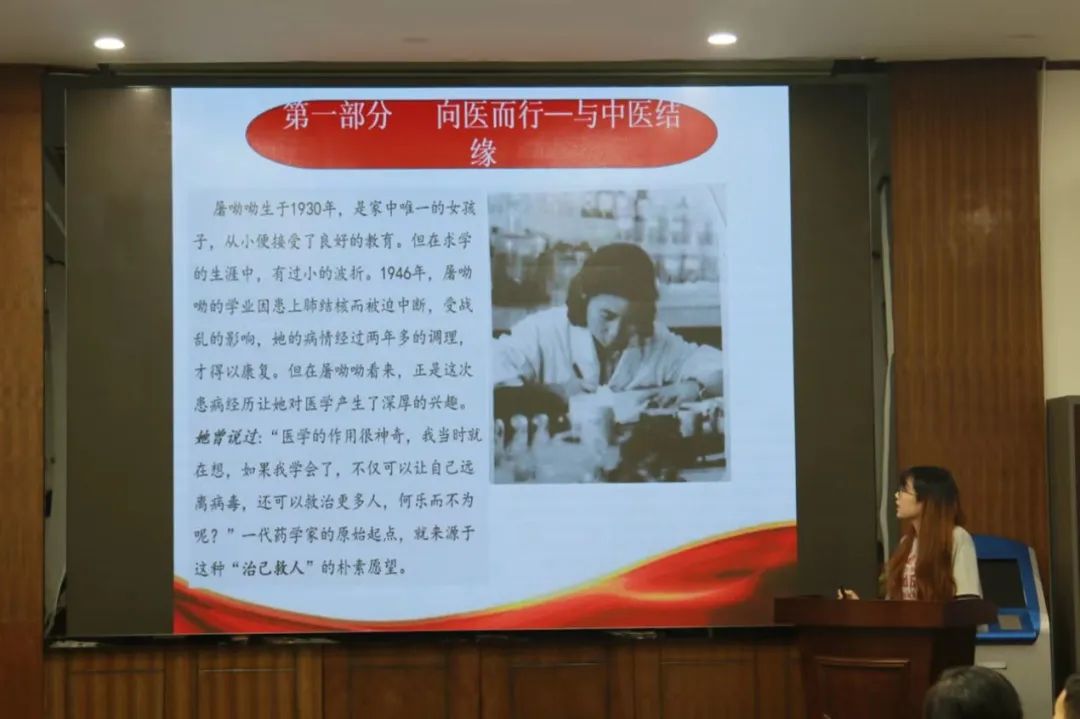 屠呦呦的父亲用《诗经》中“呦呦鹿鸣,食野之蒿”给她取名。这种奇妙的联系仿佛是一种预言。许多年后,因为这株叫“青蒿”的小草,屠呦呦打破了在自然科学领域中国本土科学家诺贝尔奖“零”的记录。丁苗同学说作为新时代的青年,我们应继承老一辈科技工作者执着坚守,无私奉献的精神。科学研究要耐得住寂寞和漫长的验证过程,需要不断努力奋斗,能在国内外期刊发表多少学术论文,并不是一个真正科研工作者追求的终极目标,只有树立起朴实的理念,才有可能取得真正的成果。