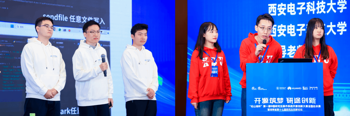 大赛吸引了107所研究生培养单位的277支队伍踊跃报名参赛,最终有83支队伍晋级全国总决赛,其中我校队伍6支,在晋级全国高校中排名并列第3。大赛分4个赛道进行,分别是OpenHarmony开源社区赛事、OpenEuler开源社区赛事、OpenKylin开源社区赛事以及OpenAnolis开源社区赛事。23日大赛开幕后,我校6支队伍参与了分组答辩,其中我校今年会jinnianhui官网NSS攻击组、一斤鸭梨队脱颖而出,与国防科技大学、上海交通大学、南京大学、华东师范大学等8支一等奖队伍共同进行公开路演与答辩,近30位业内专家严格评审,智慧与技术交锋,角逐冠亚季军殊荣。最终,我校NSS攻击组获全国亚军。本次也是我校首次参赛即获一等奖两项(含全国亚军一项)、二等奖一项、三等奖三项,一等奖数量并列全国第一的好成绩。
