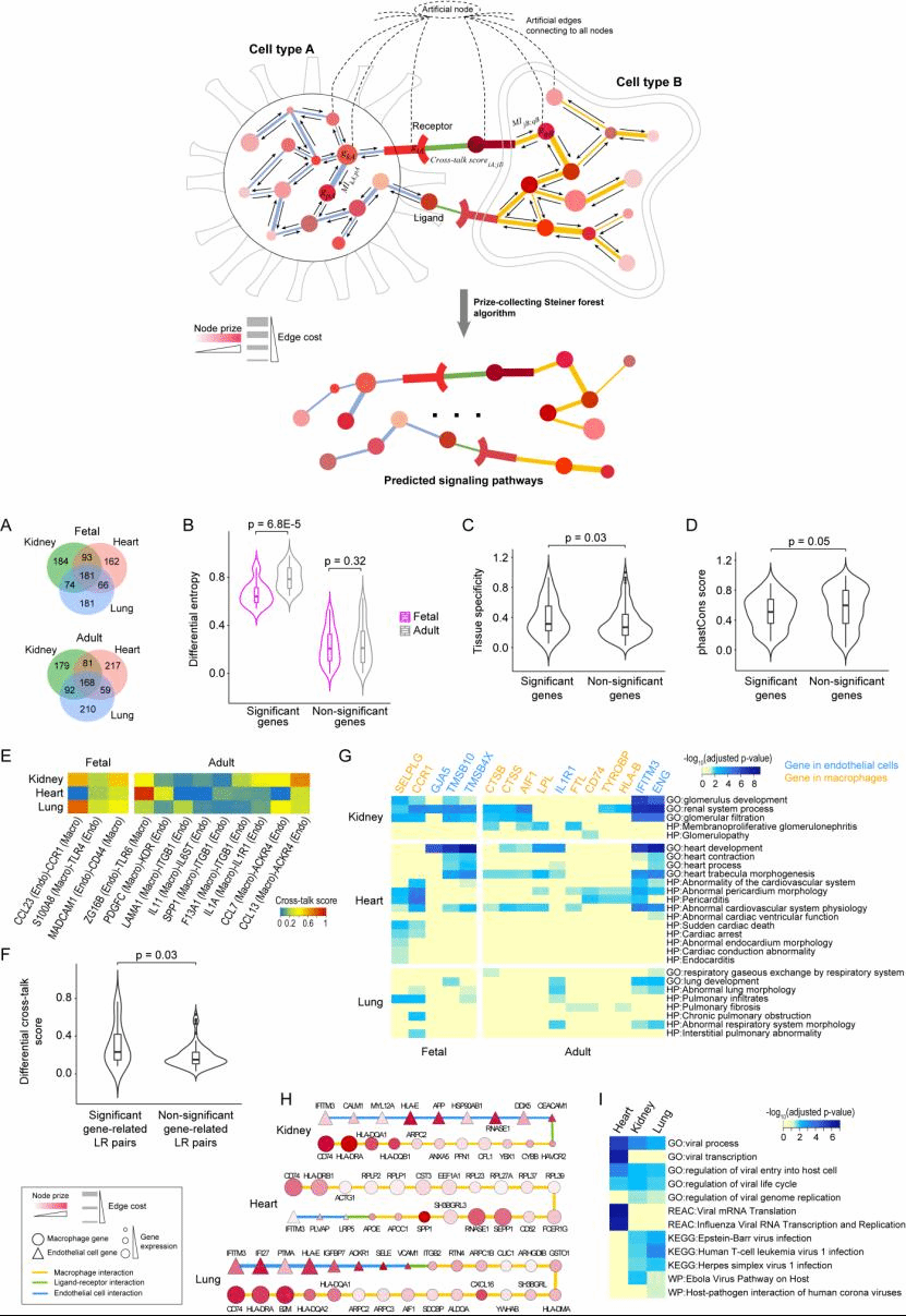 CytoTalk算法首先构建了一张集成基因网络作为拓扑骨架,包括细胞内和细胞间基因相互作用。在网络中,节点权重定义为奖励(即细胞特异性基因活性),边权重定义为代价(即两个基因间相互作用概率)。通过在该赋权集成网络中求解奖励-收集斯坦纳森林(prize-collecting Steiner forest, PCSF)问题来识别两种细胞类型间的信号转导网络。PCSF问题的目标是在集成网络中找到一个最优子网,包含具有高水平细胞类型特异性表达和与高活性配体-受体对紧密关联的基因。该项研究发表后受到BioArt微信公众号的关注和报道:https://mp.weixin.qq.com/s/Q8y4O47DZlmdPCT-vxbFYg