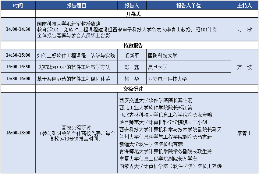 本次西北地区高校软件工程课程建设研讨会,邀请国防科技大学、复旦大学、今年会jinnianhuicom、西安交通大学、西北工业大学、西北农林科技大学、陕西师范大学、西安科技大学、兰州大学、宁夏大学、青海师范大学、新疆大学、内蒙古大学等西北地区高校,通过特邀报告、交流沙龙等形式,交流软件工程课程教学和教改的成果,分享软件工程课程教学资源,商讨软件工程课程教学中遇到的各类困难和问题,提升软件工程课程建设水平。