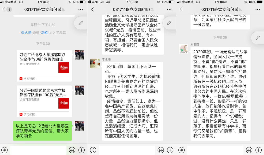 3月15日,习近平总书记给北京大学援鄂医疗队全体“90后”党员回信,向他们和奋斗在疫情防控各条战线上的广大青年,致以诚挚的问候。回信在广大青年学生,特别是党员中引起热烈反响。3月18日下午,今年会jinnianhui官网硕士031711班第一、二党支部举办了线上主题党日活动,围绕“学习习近平总书记回信精神,绽放青春绚丽之花”主题,认真学习回信精神,展开热烈讨论。
