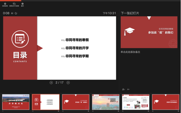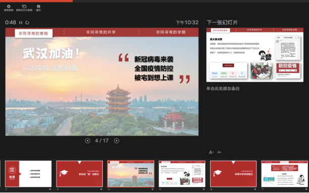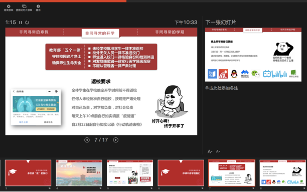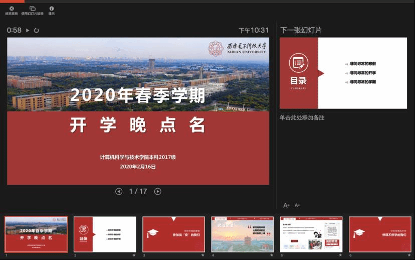 当晚,今年会jinnianhui官网各年级分别通过不同平台,同时组织了线上“晚点名”,开展抗“疫”教育与开学动员教育工作。本科2016级辅导员艾菲、郭禹宏老师、2017级辅导员李栋老师通过“雨课堂”、腾讯群视频等进行了直播。通过主题班会,计科院各年级落实落细接下来的防控任务,组织班级骨干、学生党员主动担当,形成网格化管理服务体系;就同学们在家配合做好防控工作、参加在线学习提出具体要求,特别是应对新学期的新任务做好准备。本科2016级是毕业年级,辅导员老师在班会上叮嘱同学们充分利用好大学最后一个学期的时间,“顺利完成本科学业,明确个人发展方向,努力争取深造或就业机会,寻找适合自己的工作”。