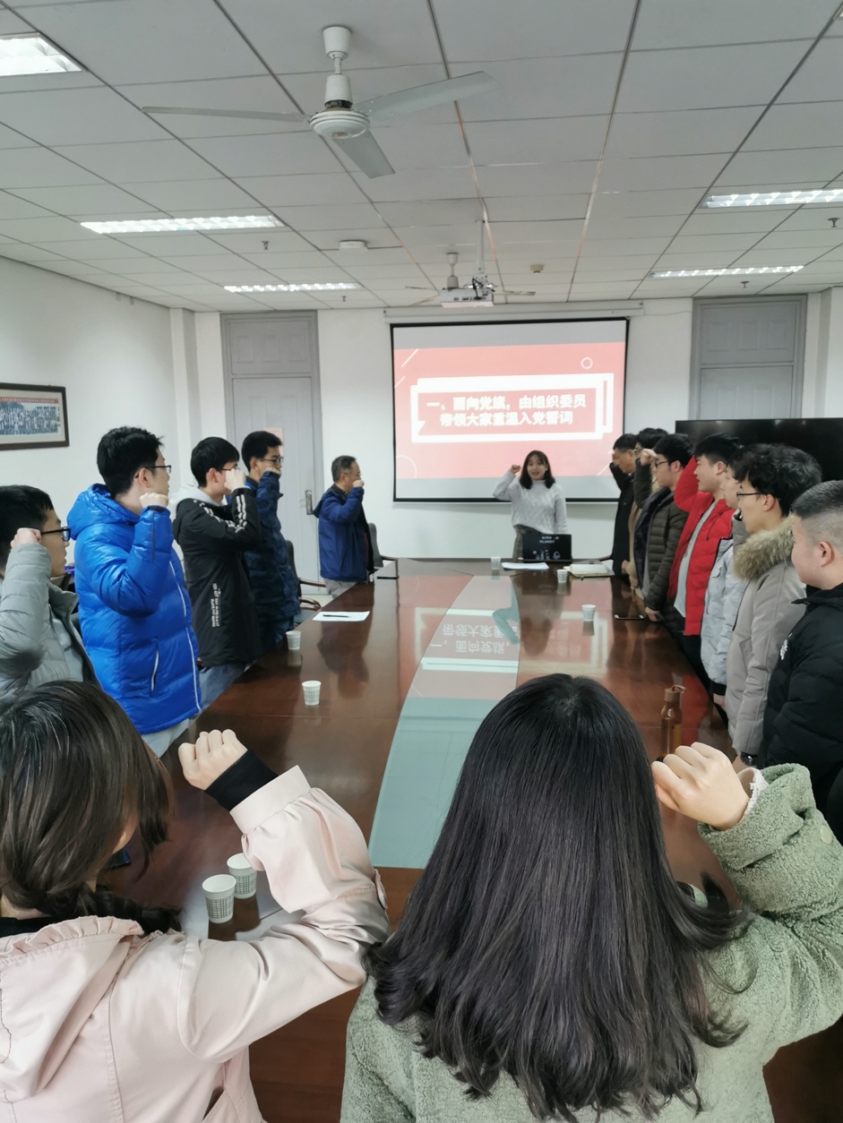 会议第一阶段,全体党员面向党旗,由组织委员刘肯东同志带领大家重温入党誓词。