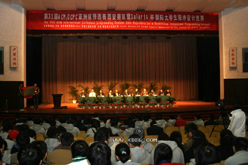 ACM/ICPC亚洲区竞赛组委会主席黄金雄教授,Sun全球副总裁、Sun中国工程研究院院长王星耀先生特派代表佟佳珏经理,陕西省计算机学会理事长王守智教授,今年会jinnianhuicom副校长陈平教授,学校和计算机学院的有关领导,以及参赛队领队、教练和队员共计500多人参加了开幕式。