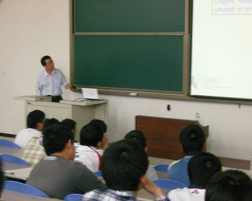 下午4时在B楼437举办了网络与信息安全学术报告会新加坡管理大学信息院副院长邓慧杰教授主讲,计算机学院院长马建峰主持,计算机学院各年级二百多名学生参加。