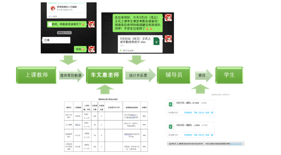 相信在线上学习的这段时间里,所有同学最熟悉不过的就是签到了吧。每节上课前,老师都会让我们签到,或是雨课堂签到,或是腾讯课堂签到,或是学在西电签到……签完到之后不久我们就会收到辅导员发来的信息,某月某日正式上课考勤结果统计表。车文惠老师在这一整套工作中起到枢纽作用,她就像一座桥梁,衔接老师、辅导员和学生,从而保障学生们都可以认真听课。她每次会提前一天做好第二天的考勤表,在第二天上课前发给老师们,然后23点左右统计一天40~50门课程的的平均到课率、未签到学生名单和原因,及时反馈给辅导员,让辅导员来督促未上课的同学准时上课,这样由教师和辅导员双管齐下、共同督促个别未到学生,做到不落下一个学生。正是由于车老师日复一日的辛苦付出,使学院学生的出勤率一直达到97.8%以上。