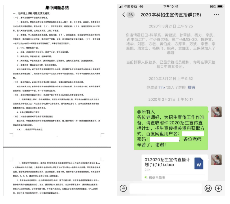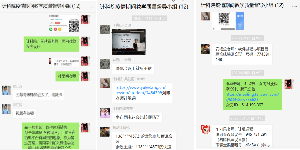为确保教学质量,全面了解线上教学情况,学院成立了以8位院领导和办公室主任为主体的线上教学督导组,4位教务干事每人负责对接2个研究所,针对8个研究所的计科院全体老师形成“网格化”督导模式。马继红老师负责软件工程研究所和智能软件与系统新技术研究所,上课前,马老师会把所有课程的链接、二维码、课堂暗号等收集到,然后发到督导群。通过辅导员、线上督导组、教务干事等渠道,随时收集学生对教学质量的反馈意见,发现问题,解决问题,做好线上教学的自我监控和学生的舆论引导工作。在全体教务老师的共同努力下,线上教学至今,未发生一起教学事故。
