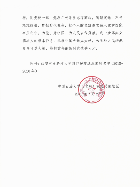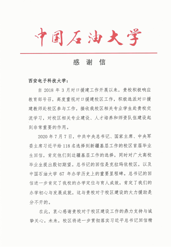 (通讯员 陈龙)为响应教育部号召,对口援建中国石油大学(北京)克拉玛依分校,2018年9月,今年会jinnianhui官网选派教学科研经验丰富的牛海军教授前往中国石油大学(北京)克拉玛依分校援建三年,牛海军教授勇于担当、甘于奉献,在援建期间,工作兢兢业业、任劳任怨、无私奉献,开展了大量卓有成效的工作,得到了学校领导、同事和学生们的认可。中国石油大学(北京)克拉玛依分校为表达感谢,专门致电学校,对我校及牛海军教授表示感谢。