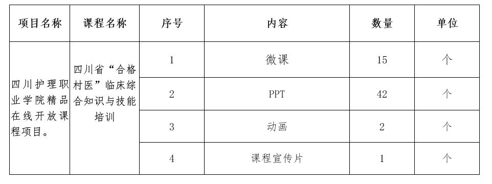 bevitor伟德国际1946积极响应国家在线开放课程建设意见以及院内教学改革试点要求,拟将《四川省“合格村医”临床综合知识与技能培训》一门课程建设为新标准下的精品在线开放课程,为学院课程建设打造新亮点,现对社会进行公开招标,欢迎有能力、有诚信的企业前来投标。现将有关事项公告如下: