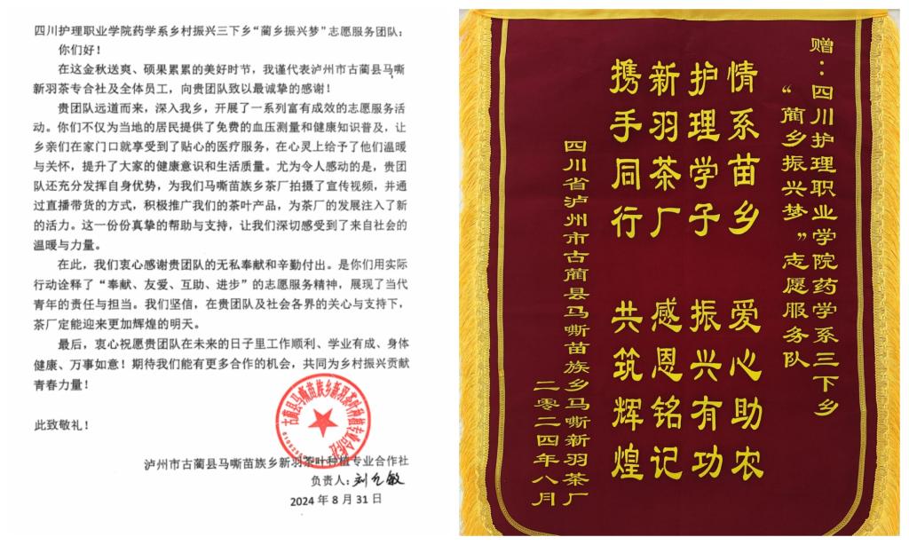 一份荣誉,一份信任,一份动力。古蔺县马嘶苗族乡新羽茶厂的感谢信和锦旗是对学院药学系开展志愿服务成果的充分肯定,充分调动了学生们参与志愿服务的积极性,坚定了广大青年奔赴基层,建设家乡,为乡村振兴贡献青春力量的信心。下一步,药学系将持续搭建大学生乡村振兴志愿服务平台,培养学生责任担当,促进学生成长,为乡村振兴事业添砖加瓦。