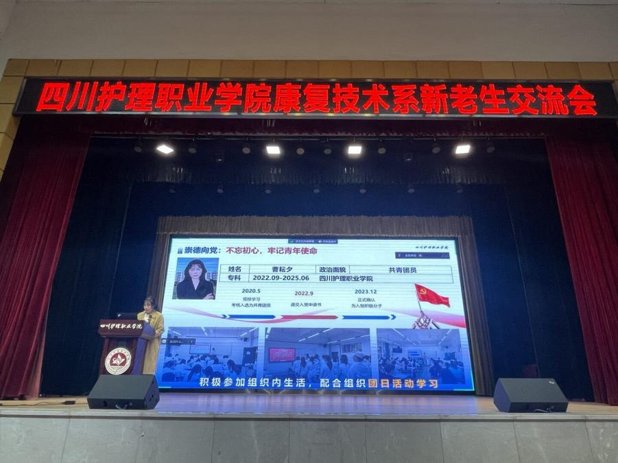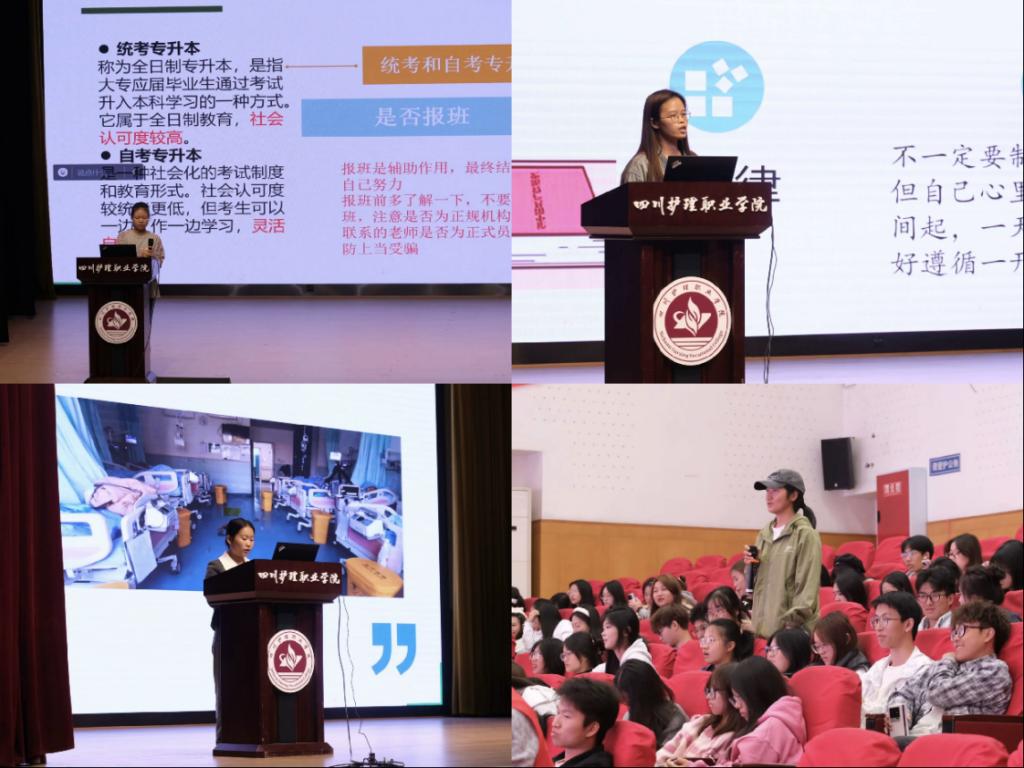 会上,2024学年国家奖学金获评者、康复治疗技术专业2022级曹耘夕,以其亲身经历,讲述了自己的求学之路,激励同学们以卓越为目标,勇于追梦,用实际行动谱写青春华章;2019级张兰,毕业顺利考进简阳市妇幼保健院,她从就业角度出发,分享了自己的求职经历和心得体会,帮助大家树立正确的就业观念,鼓励勇敢迈出求职第一步;通过学历提升进入本科院校继续学习的来自于2021级康复治疗技术专业李蒙熹、周怡孜,中医养生保健专业徐翎菡,预防医学专业蒋雨芯分别就各自专业的就业前景及学历提升经验进行分享,为同学们提供了有关行业和专业的更多资讯,帮助大家制定长远的学习与职业规划。