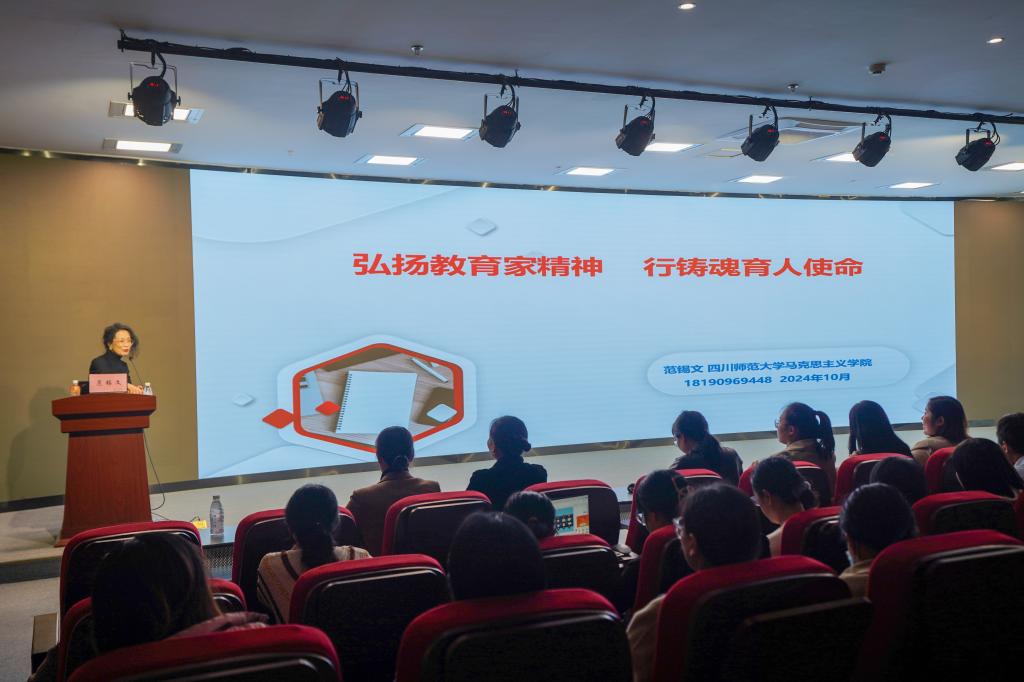 本次讲座特邀四川师范大学马克思主义学院副院长、四川师范大学课程思政研究中心副主任范锡文教授,以《弘扬教育家精神 行铸魂育人使命》为题,围绕深刻领会教育论述战略视野、系统把握教育论述的内容体系、全面认识教育强国的重大意义等方面深入浅出、娓娓道来展开讲授。她指出,作为新时代教师要保持教育初心,坚持价值立场的正确性做对的教育、坚守立德树人的原则性做好的教育、坚定教育担当的筑梦人做强的教育。
