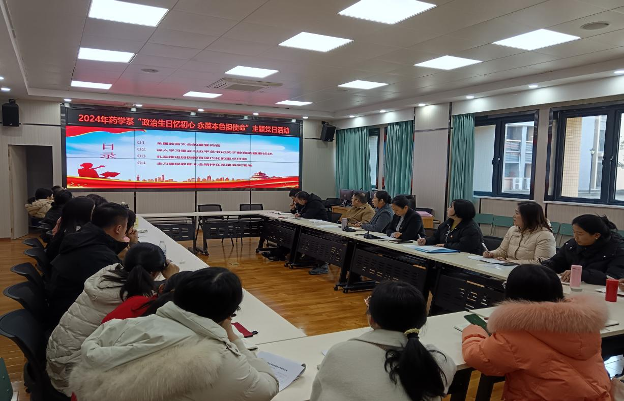 药学系主任向俊蓓作题为《深入学习贯彻全国教育大会精神 共谱教育发展新篇章》专题辅导,重点围绕习近平总书记关于教育的重要论述、全国教育大会精神以及扎实推进加快教育现代化的重点任务等内容,结合药学系发展,提出落实立德树人根本任务、建立新型产教融合机制、建设高水平双师队伍等9大任务具体改革措施,全力确保教育大会精神在系部落实落地。