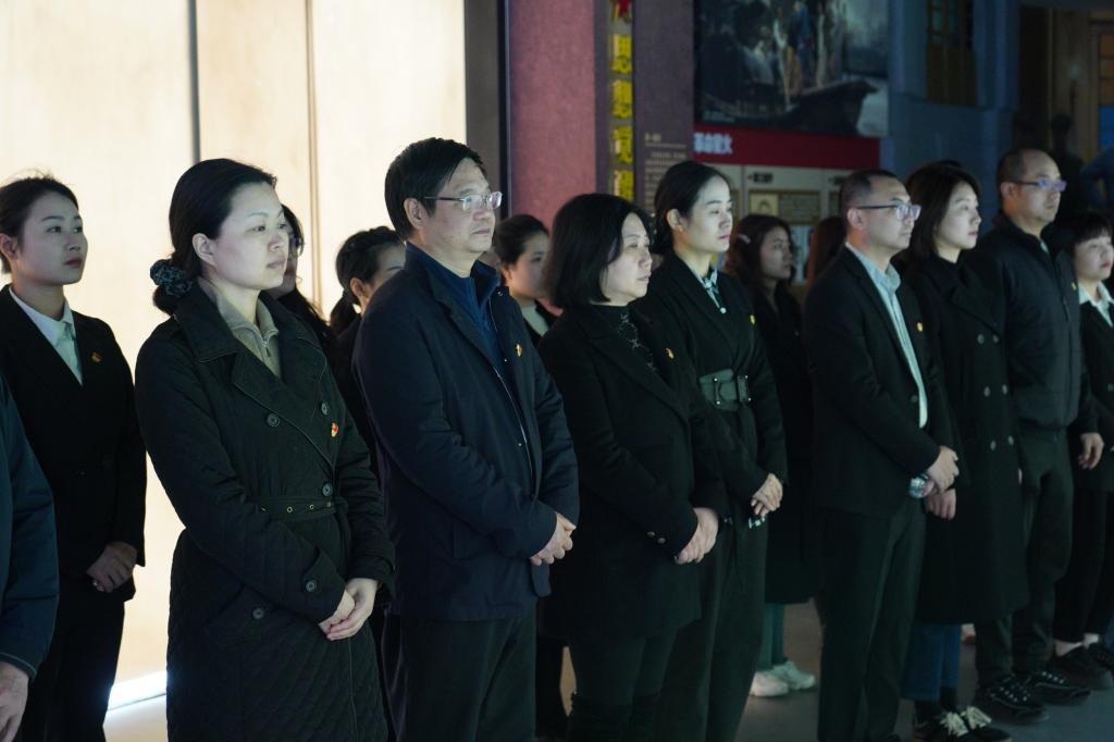 在革命烈士纪念碑前,全体党员整齐列队,庄严肃立,齐唱国歌、默哀并向英勇献身的革命先烈敬献花篮,表达对英雄烈士无限敬意和追思。