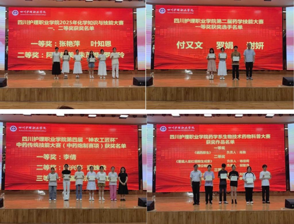6月12日,药学系在德阳校区举行2025年专业技能大赛颁奖仪式,为近两个月举办的第四届“神农工匠杯”中药传统技能大赛、第二届药学技能大赛、首届化学知识与技能大赛和生物技术药物科普大赛等四大赛项画上圆满句号。系党总支书记施晓莉、副主任徐曾涛,赛项负责教师及获奖学生代表齐聚一堂,共同见证荣耀时刻。