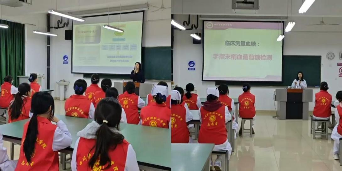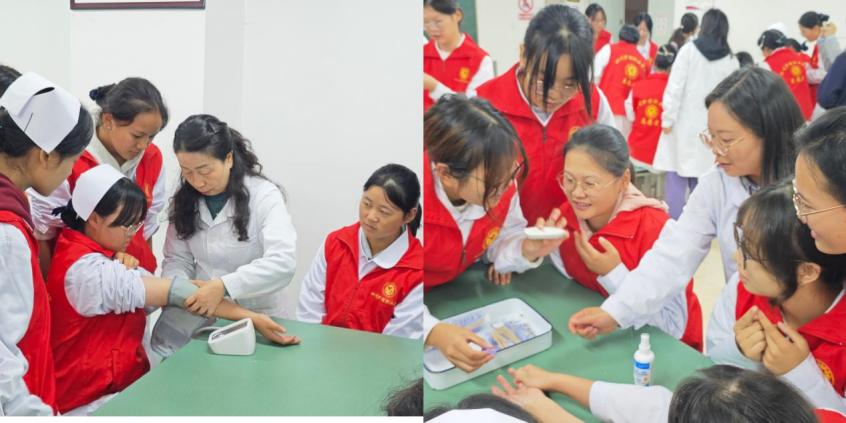 在技能培训环节,谯邦兴副教授系统讲解了血压、血糖测量的规范操作流程与注意事项,演示了仪器使用步骤、数据记录要点以及在社区服务中的沟通技巧,并分组开展实操训练。