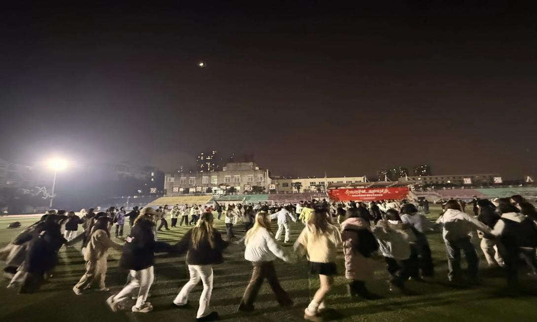 在“互动大合跳”环节,全体师生移步操场,在彝族同学的带领下,大家手拉手跳起传统舞蹈。伴随极具感染力的民族旋律,大家踏着同一节奏、绽放同一笑容,夜空灯光与跃动身影交织,舞出了真挚的快乐,也跳出了“民族团结一家亲”的深厚情谊。