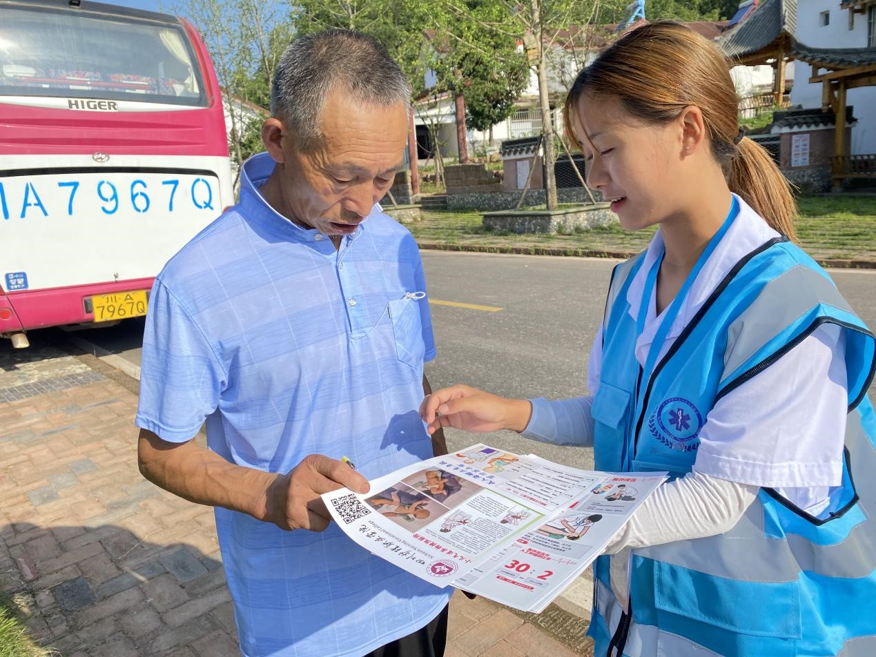 (志愿者向当地村民发放健康宣传手册,宣讲健康知识)