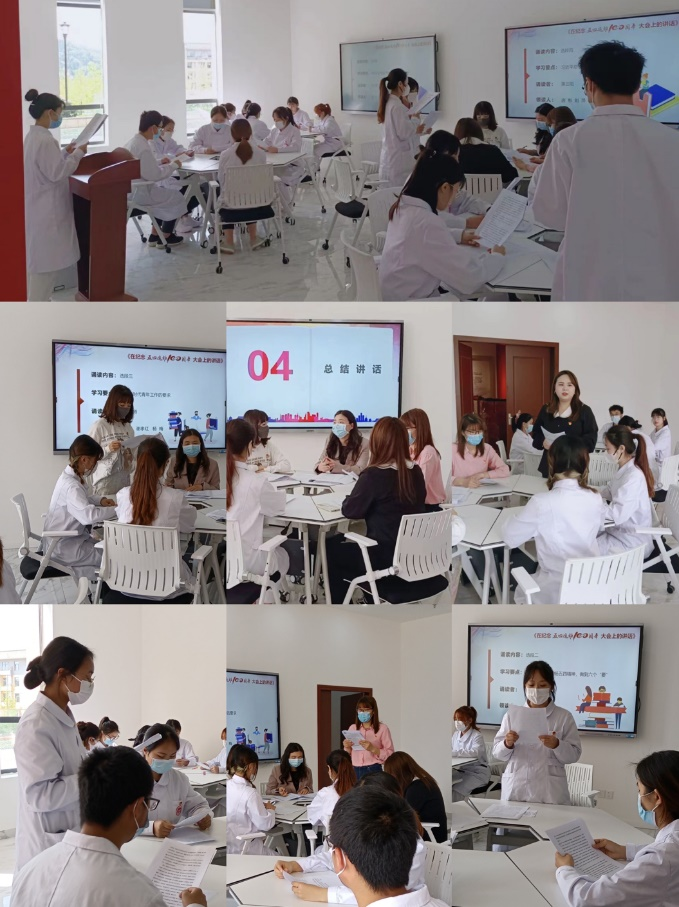 此次活动的诵读主题是《论中国共产党历史》中《在纪念五四运动一百周年大会上的讲话》,师生们以五四运动的历史意义、新时代青年发扬五四精神的六个重要要求、做好新时代青年工作以及习近平总书记对新时代青年的勉励等四个部分为主要内容,通过个人独诵、小组合诵和集体朗诵等相结合方式,以深沉真挚的情感、铿锵有力的声音、慷慨激昂的语调,在原滋原味诵读中去重温习近平总书记对新时代青年学生的深情寄语,去读懂总书记对青年学生的谆谆嘱托,去牢记总书记对青年学生提出的六点希望。诵读中每位师生都结合诵读内容谈心得体会,谈感悟感想。