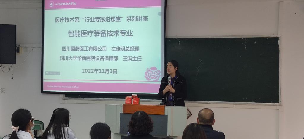 为提高人才培养质量,帮助学生更好地对接行业、岗位,了解行业最新发展,11月3日下午,医疗技术系邀请四川大学华西医院设备保障部部长王溪、四川国药医工工程技术有限公司总经理左佳明及专家团队作“智能医疗设备行业发展现状与趋势”专题讲座。学院副院长姚永萍出席本次讲座,智能医疗装备技术专业全体学生到现场聆听。