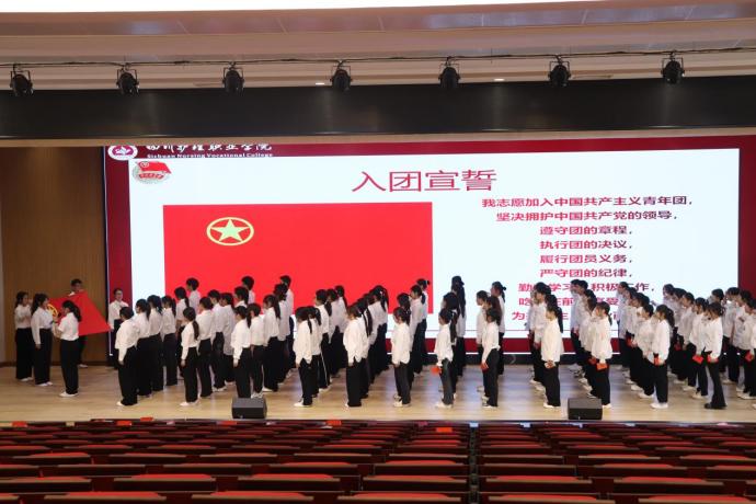 入团仪式在国歌声中拉开序幕。首先,优秀团员代表郑丹妮宣读新团员名单;与会老团员代表为新团员们佩戴上团徽并颁发团章。