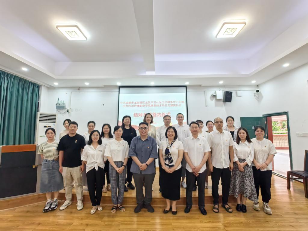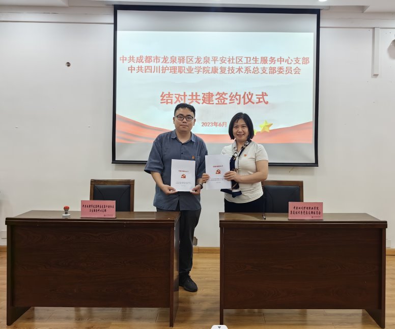 深入贯彻落实党的二十大精神,充分发挥党建引领作用,推进康复技术系党总支与龙泉平安社区卫生服务中心党支部的全方位合作,6月25日,康复技术系党总支在学院成都校区与龙泉平安社区卫生服务中心党支部举行结对共建签约仪式。双方党组织书记和全体党员参加了此次活动。活动由康复技术系党总支书记黄萍主持。
