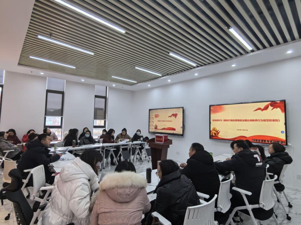 近日,教育部印发《新时代高校思想政治理论课教师行为规范和准则》的通知。思政部第一时间组织专题学习,将学习《新时代高校思想政治理论课教师行为规范和准则》作为高标准推动高校思政课教师师德师风建设的重要契机和建设高素质思政课教师队伍的重要举措,推动培养思政教师努力成为“政治强、情怀深、思维新、视野广、自律严、人格正”的好老师。