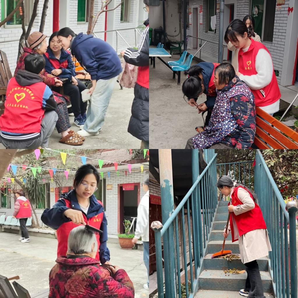 志愿者们对养老院现住老人年龄层次、健康等方面进行调研,发现院内高龄老人居多,部分老人行动不便,且伴有不同程度的身体疾病。于是迅速展开行动,协助护理人员打扫卫生,为老人营造一个舒适整洁的生活环境;帮助老人梳发,修剪指甲;陪伴老人散步,认真聆听他们的人生故事;还利用自己所学的按摩手法为老人进行手指和肩颈按摩。志愿者们的表现得到养老院工作人员和老人的一致好评。