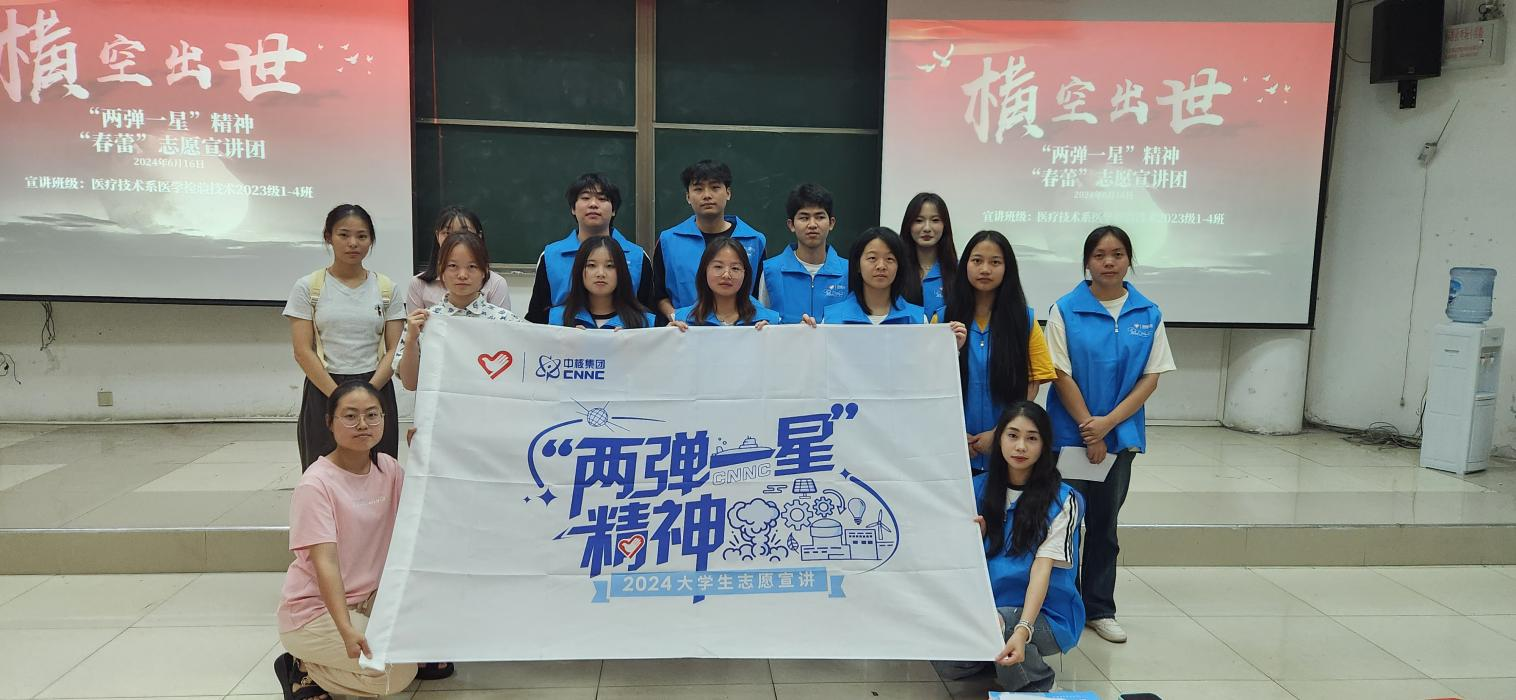 “两弹一星”精神“春蕾”宣讲团是医疗技术系辅导员党支部组织成立的一支志愿服务队,秉承“奉献、友爱、互助、进步”的志愿精神,持续开展“两弹一星”精神的宣传和科普活动,以发挥系部志愿实践活动育人作用,让“两弹一星”事业和“两弹一星”精神深入到每一位学子心中。